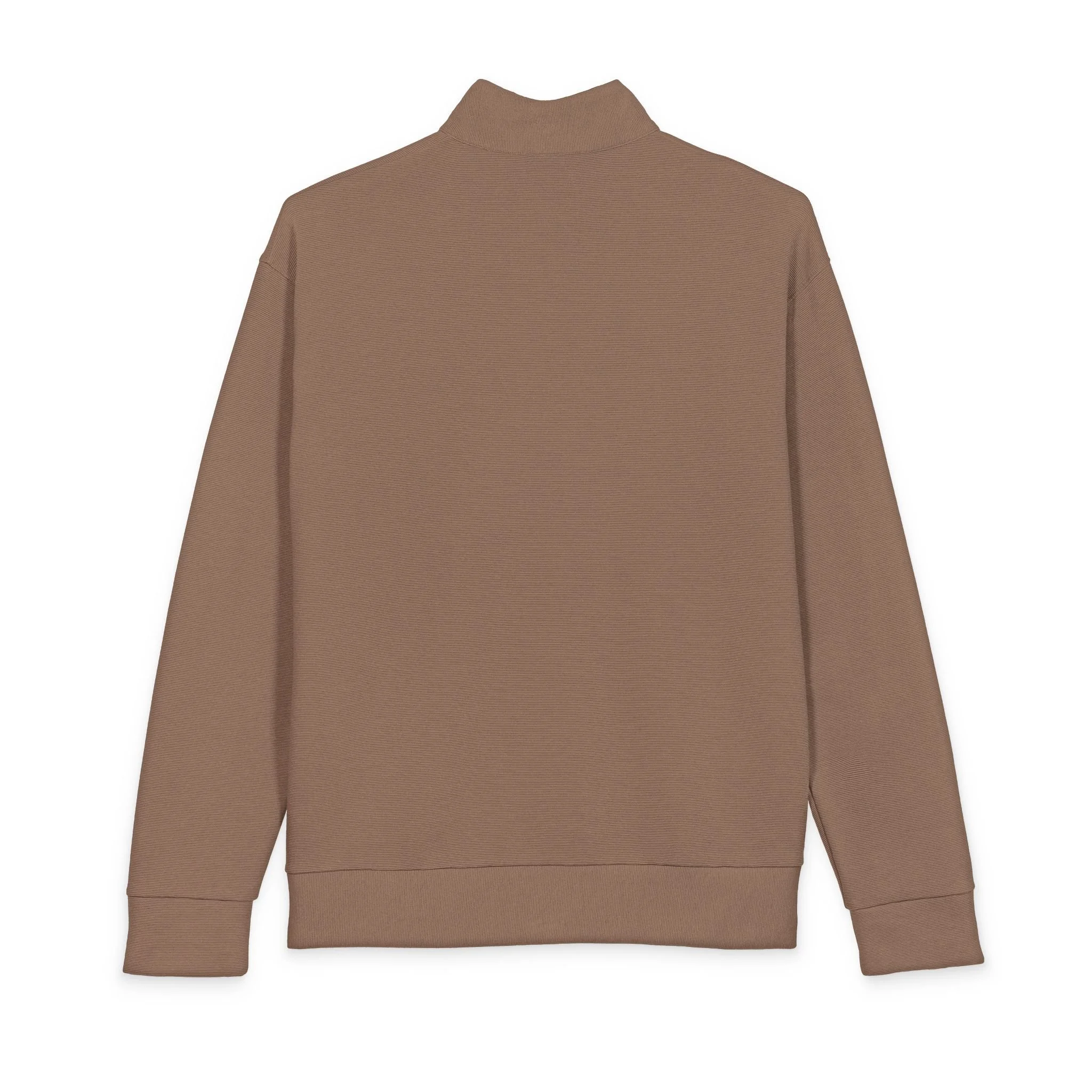 This midweight quarter-zip blends structured comfort with subtle, modern detail. The ribbed linear texture adds depth across the chest and sleeves, while the short metal zipper gives a clean, slightly sporty silhouette. Built from a cotton-rich blend with a touch of stretch, it wears like a favorite sweater but holds its shape through movement. The odor-resistant finish and self-banded cuffs and hem make it dependable for long days—whether layered under a coat for a city commute or worn solo on a crisp weekend morning. The small, abstract chest motif provides a restrained visual accent that keeps the look refined and easy to pair with denim or tailored trousers.